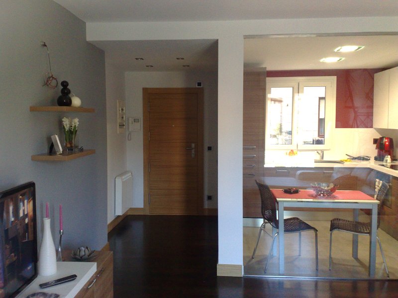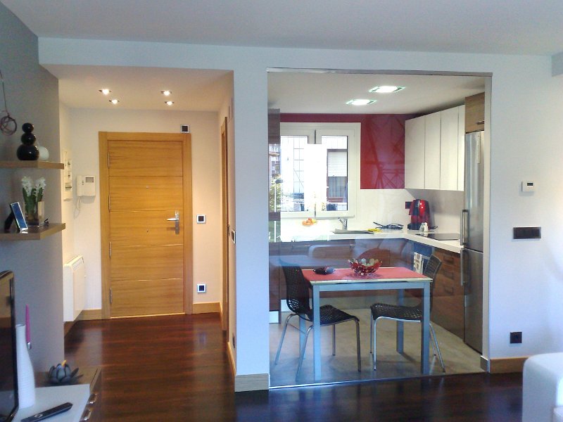 Tras contactar con nosotros el propietario de la vivienda, le hicimos un estudio y replanteo de distribución para albergar nuevos espacios mas acorde con su estilo de vida, ampliando el salón uniéndolo al hall de entrada en el cual ubicamos la puerta de entrada a la cocina, se redujo el tamaño de la cocina consiguiendo una espacio funcional y de diario, colocando como tabique un enorme cristal el cual hace de división física pero no óptica, proporcionando sensación de amplitud al igual de aprovechamiento de la luz natural.