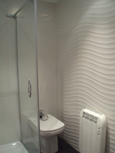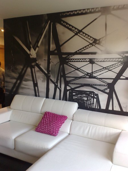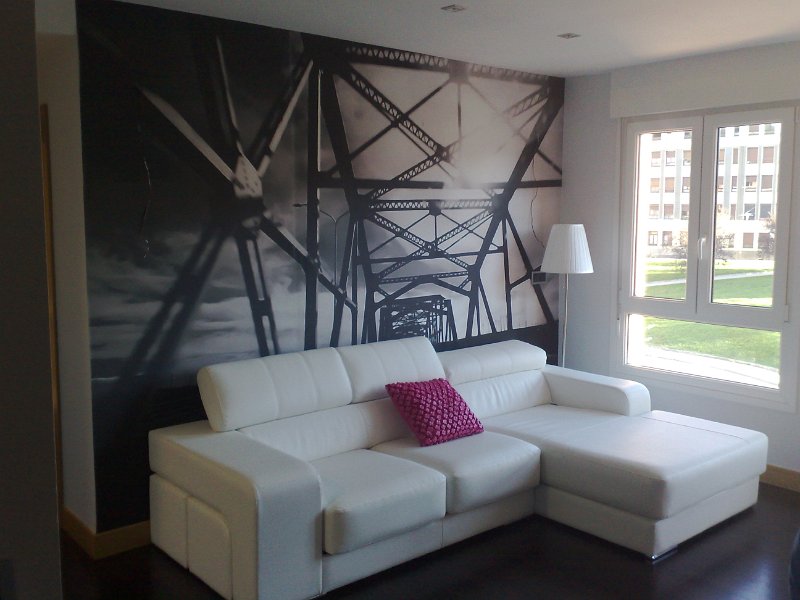 En el salón se opto por poner un gran mural partiendo de una fotografía e imprimiéndola escala de la pared a empapelar, dando como resultado una imagen vanguardista y elegante.